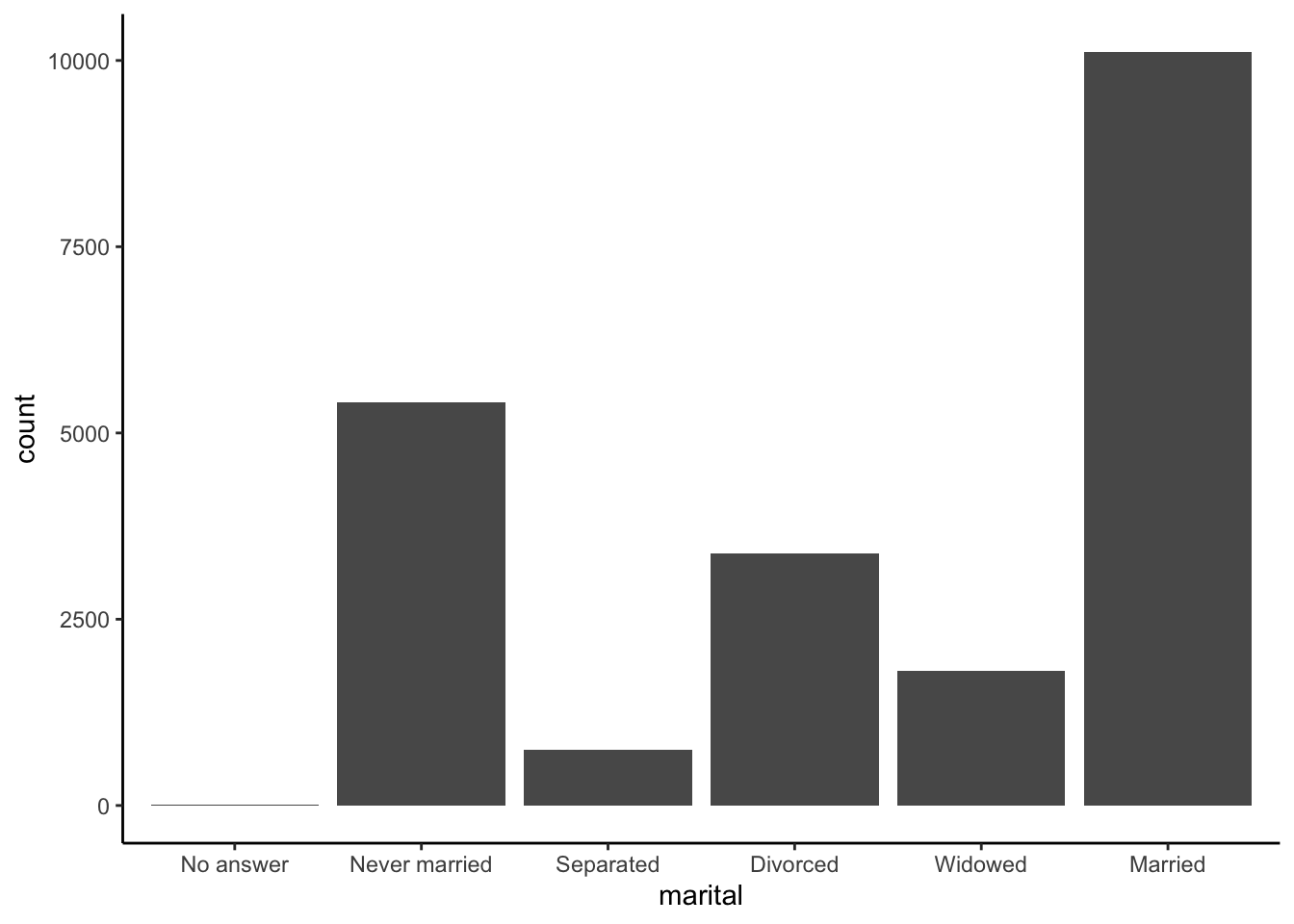 We’ll use a subset of the General Social Survey (GSS) dataset available in the forcats pacakges.