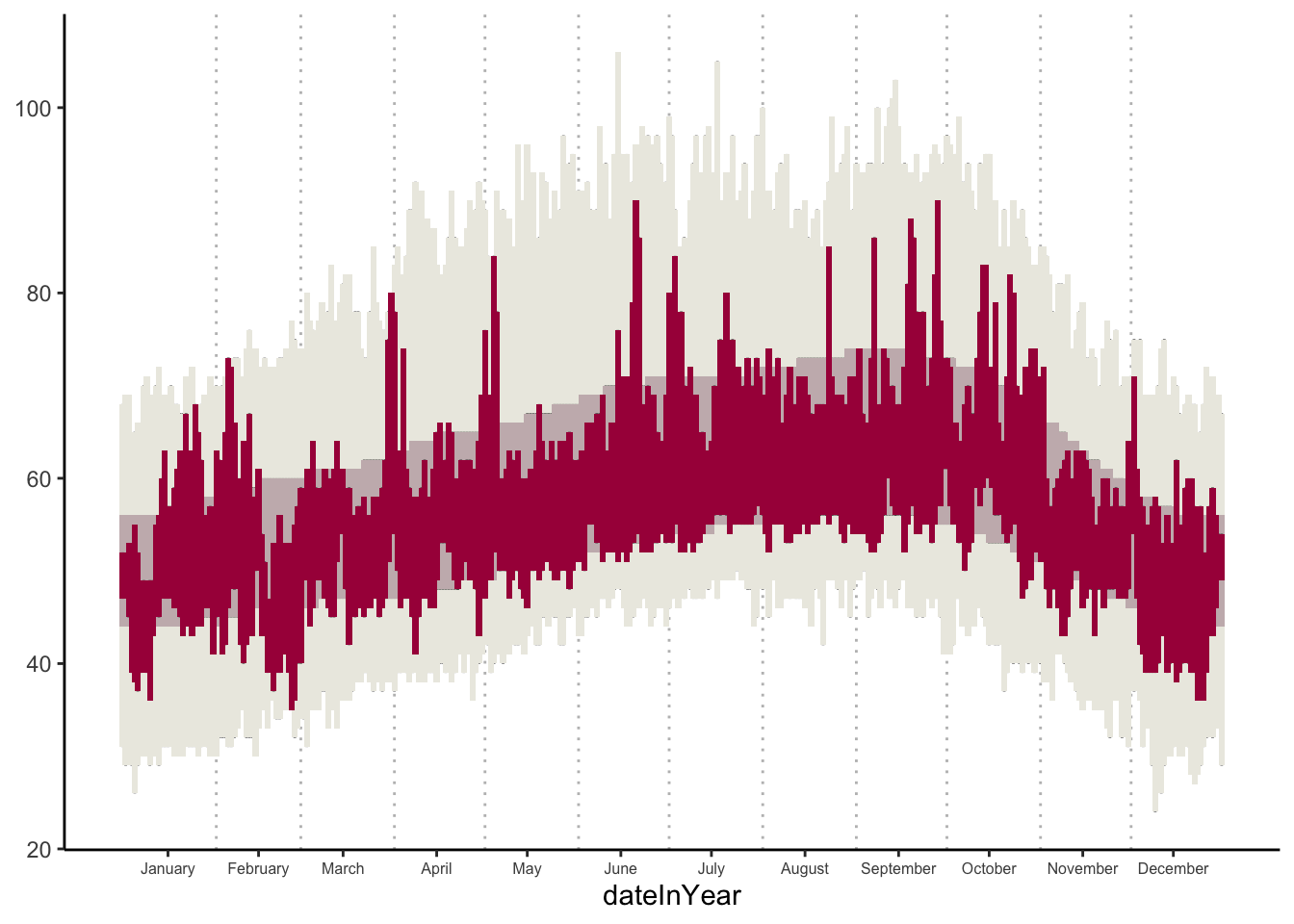 geom_rect(aes(xmin=dateInYear-1,xmax=dateInYear+1, ymin=NormalLow,ymax=NormalHigh), fill="#C8B8BA", data=weather) +