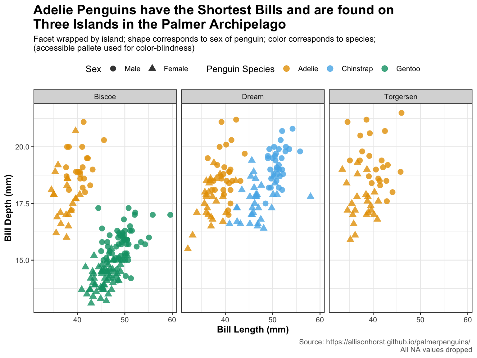 #Final visualizationggplot(penguins_clean, aes(x=bill_len, y=bill_dep, color=species, shape=sex)) +geom_point(alpha =0.8, size =3) +scale_color_manual(values =c("#E69F00","#56B4E9","#009E73" )) +facet_wrap(~island) +labs(title ="Adelie Penguins have the Shortest Bills and are found on \nThree Islands in the Palmer Archipelago",subtitle ="Facet wrapped by island; shape corresponds to sex of penguin; color corresponds to species; \n(accessible pallete used for color-blindness)",caption ="Source: https://allisonhorst.github.io/palmerpenguins/ \nAll NA values dropped",x ="Bill Length (mm)",y ="Bill Depth (mm)",color ="Penguin Species",shape ="Sex")+theme_bw() +theme(legend.position ="top",plot.title =element_text(face ="bold", size =16),plot.subtitle =element_text(size =10),axis.title =element_text(face ="bold", size =11),plot.caption =element_text(color ="gray40") )