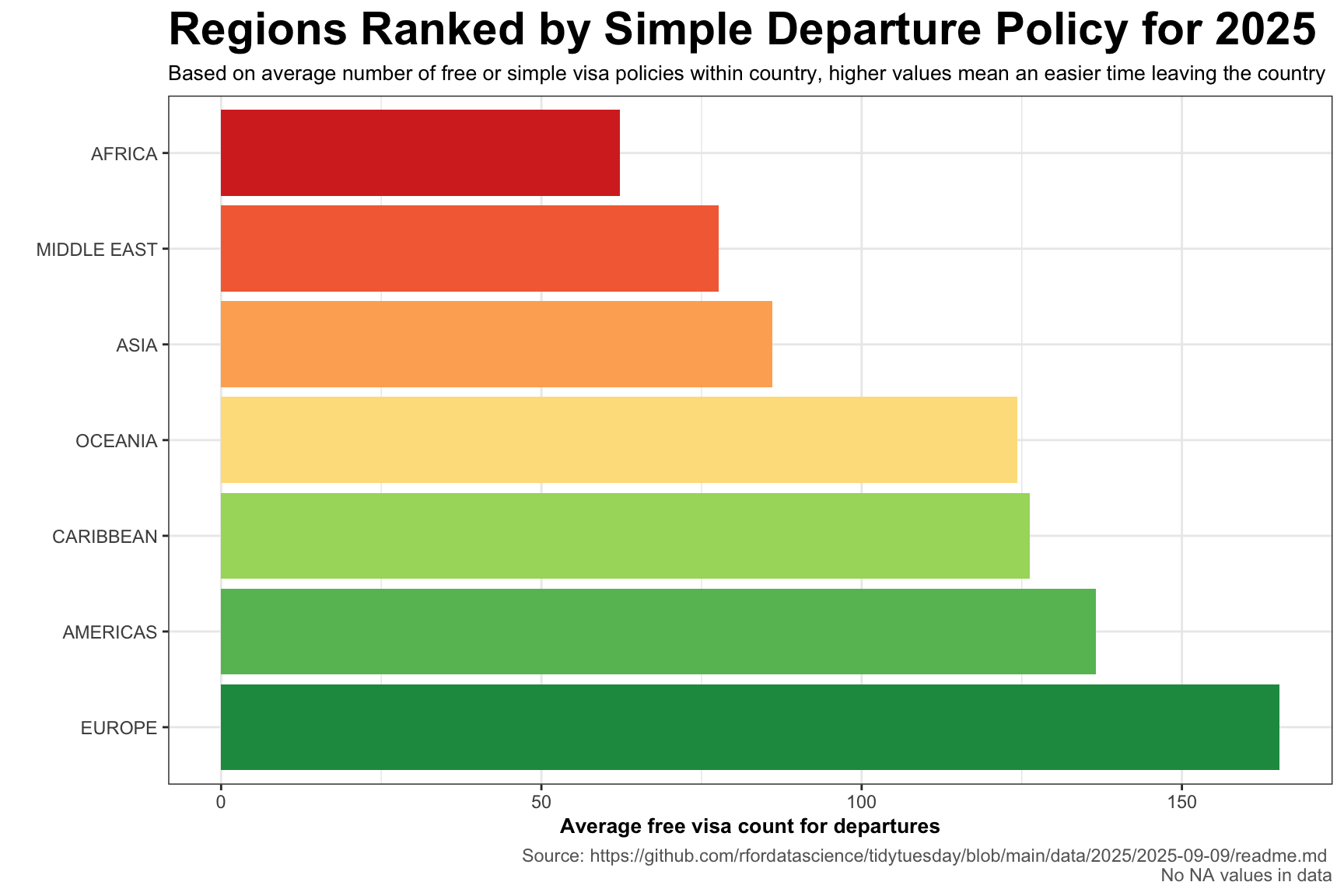 #final visualizationggplot(rank_by_year_clean, aes(x=region, y=visa, fill=region)) +geom_col() +scale_fill_manual(values =c("#1A9850","#66BD63","#A6D96A","#FEE08B","#FDAE61","#F46D43","#D73027" )) +labs(title ="Regions Ranked by Simple Departure Policy for 2025",subtitle ="Based on average number of free or simple visa policies within country, higher values mean an easier time leaving the country",caption ="Source: https://github.com/rfordatascience/tidytuesday/blob/main/data/2025/2025-09-09/readme.md \nNo NA values in data",x ="",y ="Average free visa count for departures") +theme_bw() +theme(legend.position ="none",plot.title =element_text(face ="bold", size =22),plot.subtitle =element_text(size =10),axis.title =element_text(face ="bold", size =10),plot.caption =element_text(color ="gray40") ) +coord_flip()