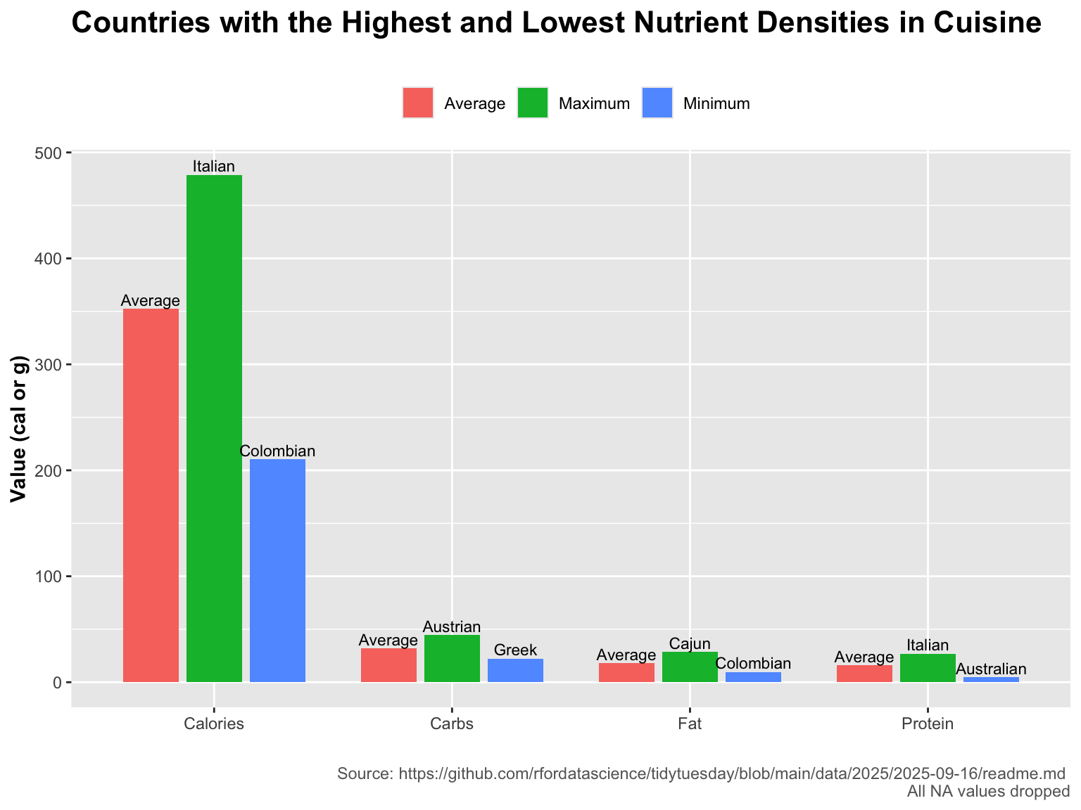 ---title: "TidyTuesday2025-Week37"---```{r}library(tidyr)library(dplyr)library(ggplot2)all_recipes <- readr::read_csv('https://raw.githubusercontent.com/rfordatascience/tidytuesday/main/data/2025/2025-09-16/all_recipes.csv')cuisines <- readr::read_csv('https://raw.githubusercontent.com/rfordatascience/tidytuesday/main/data/2025/2025-09-16/cuisines.csv')``````{r}#EDA to see if data has missingness or notcolSums(is.na(all_recipes))colSums(is.na(cuisines))``````{r}#We drop all NA values so when we summarize later everything is accuratecuisines_clean <- cuisines |>drop_na()```#Our research question is: which countries consistently have the highest carbs, calories, fat, and protien in their cuisine?We developed this research question because we have a dataset of thousands of different recipies, all labelled with their nutrient amounts, as well as the country of origin of the dish. We decided this question would be a good one to pursue so we can gain insight into the cooking styles of different countries.```{r}#summarize nutrientscuisines_clean <- cuisines_clean %>%group_by(country) %>%summarize(calories =mean(calories),fat =mean(fat),carbs =mean(carbs),protein =mean(protein))``````{r}#pivot longer to create our final graphsummary_extremes <- cuisines_clean |>pivot_longer(cols =c(fat, protein, carbs, calories),names_to ="nutrient",values_to ="value") |>group_by(nutrient) |>summarise(avg_value =mean(value, na.rm =TRUE),min_value =min(value, na.rm =TRUE),min_country = country[which.min(value)],max_value =max(value, na.rm =TRUE),max_country = country[which.max(value)],.groups ="drop" ) |>pivot_longer(cols =c(min_value, avg_value, max_value),names_to ="stat",values_to ="value" ) |>mutate(stat =recode(stat,min_value ="Minimum",avg_value ="Average",max_value ="Maximum") ) |>mutate(label =case_when( stat =="Minimum"~ min_country, stat =="Maximum"~ max_country,TRUE~"Average" ) ) |>mutate(label =case_when( label =="Cajun and Creole"~"Cajun", label =="Australian and New Zealander"~"Australian",TRUE~ label ) ) |>mutate(nutrient =case_when( nutrient =="calories"~"Calories", nutrient =="carbs"~"Carbs", nutrient =="fat"~"Fat", nutrient =="protein"~"Protein",TRUE~ nutrient ) )``````{r, fig.width=8, fig.height=6}#final visualizationggplot(summary_extremes, aes(x = nutrient, y = value, fill = stat)) + geom_col(position = position_dodge(width = 0.8), width = 0.7) + geom_text( aes(label = label), position = position_dodge(width = 0.8), vjust = -0.3, size = 3 ) + labs(title = "Countries with the Highest and Lowest Nutrient Densities in Cuisine", subtitle = "", caption = "Source: https://github.com/rfordatascience/tidytuesday/blob/main/data/2025/2025-09-16/readme.md \nAll NA values dropped", x = "", y = "Value (cal or g)", fill = "") + theme( legend.position = "top", plot.title = element_text(face = "bold", size = 16), plot.subtitle = element_text(size = 10), axis.title = element_text(face = "bold", size = 11), plot.caption = element_text(color = "gray40") )```