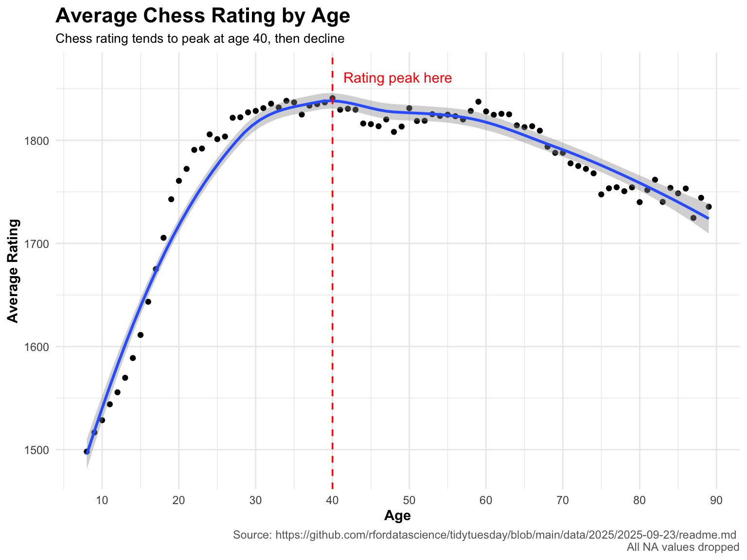 #Final visualizationggplot(chess, aes(x = age, y = avg_rating)) +geom_point() +labs(x ="Age", y ="Average Rating",title ="Average Chess Rating by Age",subtitle ="Chess rating tends to peak at age 40, then decline",caption ="Source: https://github.com/rfordatascience/tidytuesday/blob/main/data/2025/2025-09-23/readme.md \nAll NA values dropped") +scale_x_continuous(breaks =seq(0, 100, by =10)) +theme_minimal() +geom_smooth() +theme(plot.title =element_text(face ="bold", size =16),plot.subtitle =element_text(size =10),axis.title =element_text(face ="bold", size =11),plot.caption =element_text(color ="gray40") ) +geom_vline(xintercept =40,color ="red",linewidth =0.6,linetype ="dashed") +annotate("text",x =40,y =max(chess$avg_rating) +25,label ="Rating peak here",color ="red",hjust =-0.1,vjust =1)