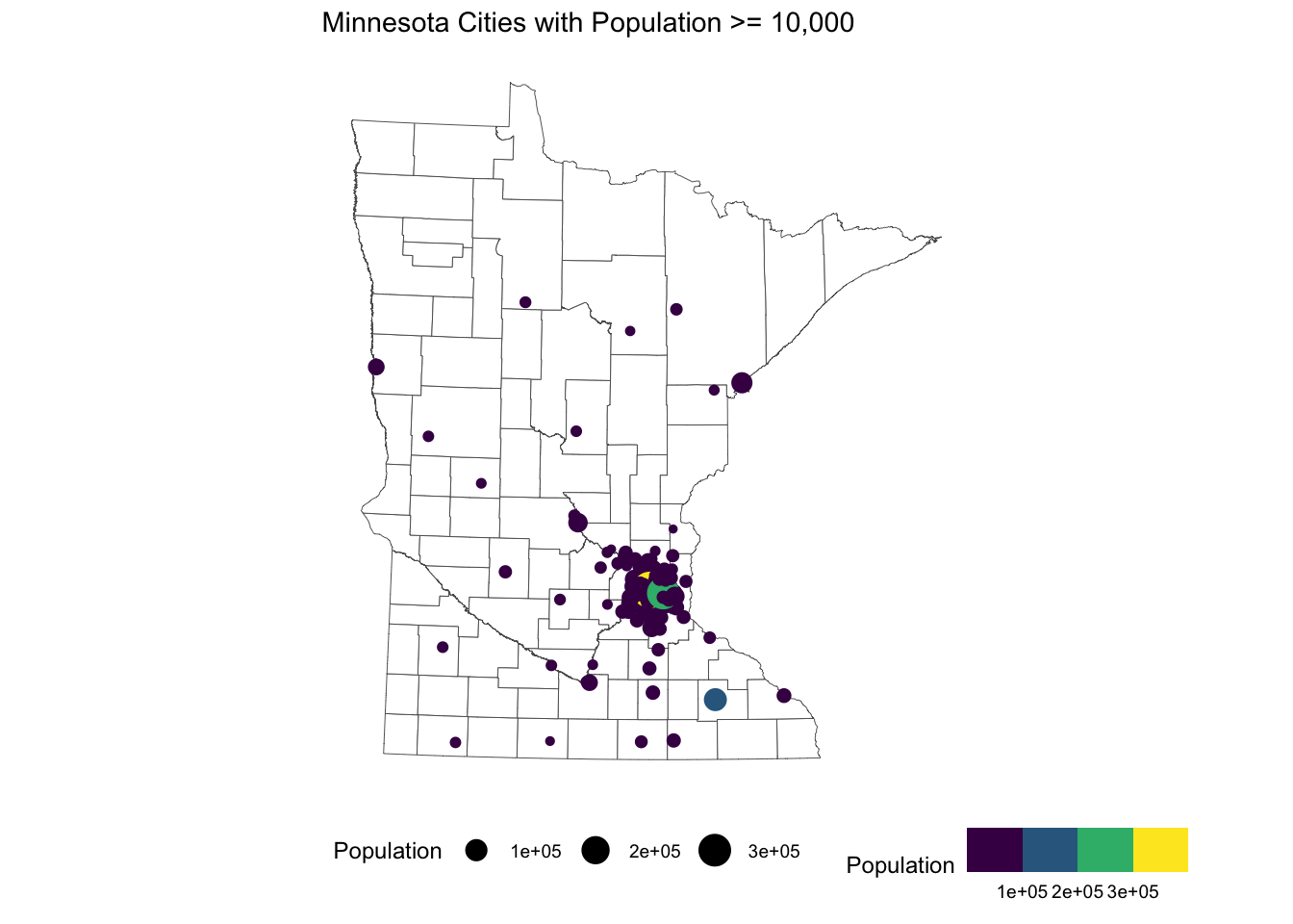 ggplot() +geom_sf(data = mn_counties, fill ="white") +geom_sf(data = mn_cities |>filter(Population >=10000), mapping =aes(color = Population, size = Population)) +# cities layerscale_color_viridis_b() +# continuous (gradient) color scalelabs(title ="Minnesota Cities with Population >= 10,000") + ggthemes::theme_map() +theme(legend.position ="bottom") # move legend