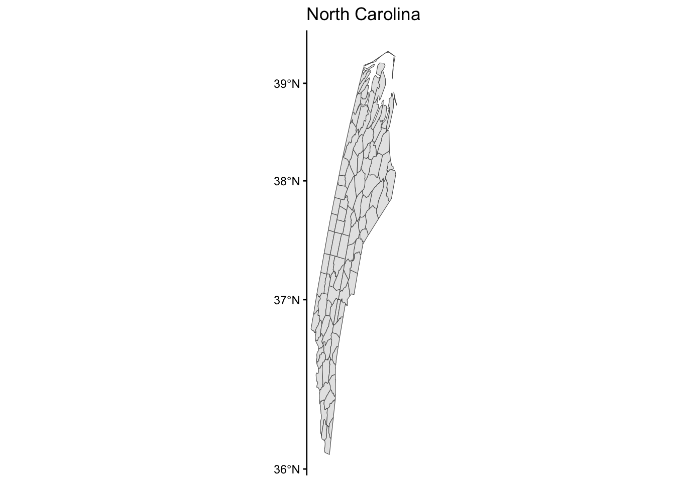 transform_and_plot <-function(spatial_obj, new_crs, title) { spatial_obj |>st_transform(crs = new_crs) |>ggplot() +geom_sf() +theme_classic() +labs(title = title)}# Example usage of this function (using a South Carolina CRS)transform_and_plot(nc, new_crs ="EPSG:32133", "North Carolina")
