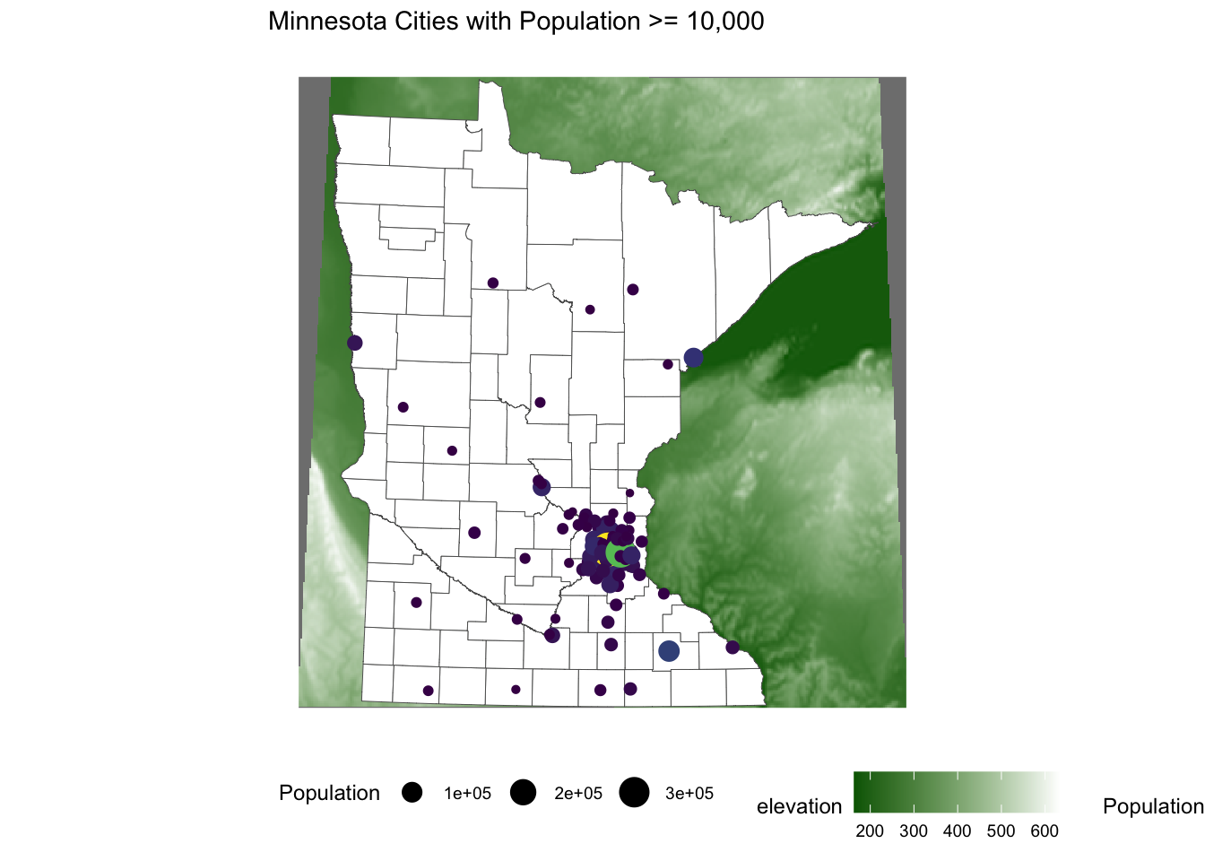 ggplot() +geom_raster(data = elev_df, aes(x = x, y = y, fill = elevation)) +scale_fill_gradient(low ="darkgreen", high ="white") +geom_sf(data = mn_counties, fill ="white") +geom_sf(data = mn_cities |>filter(Population >=10000), mapping =aes(color = Population, size = Population)) +# cities layerscale_color_viridis_c() +labs(title ="Minnesota Cities with Population >= 10,000") + ggthemes::theme_map() +theme(legend.position ="bottom")