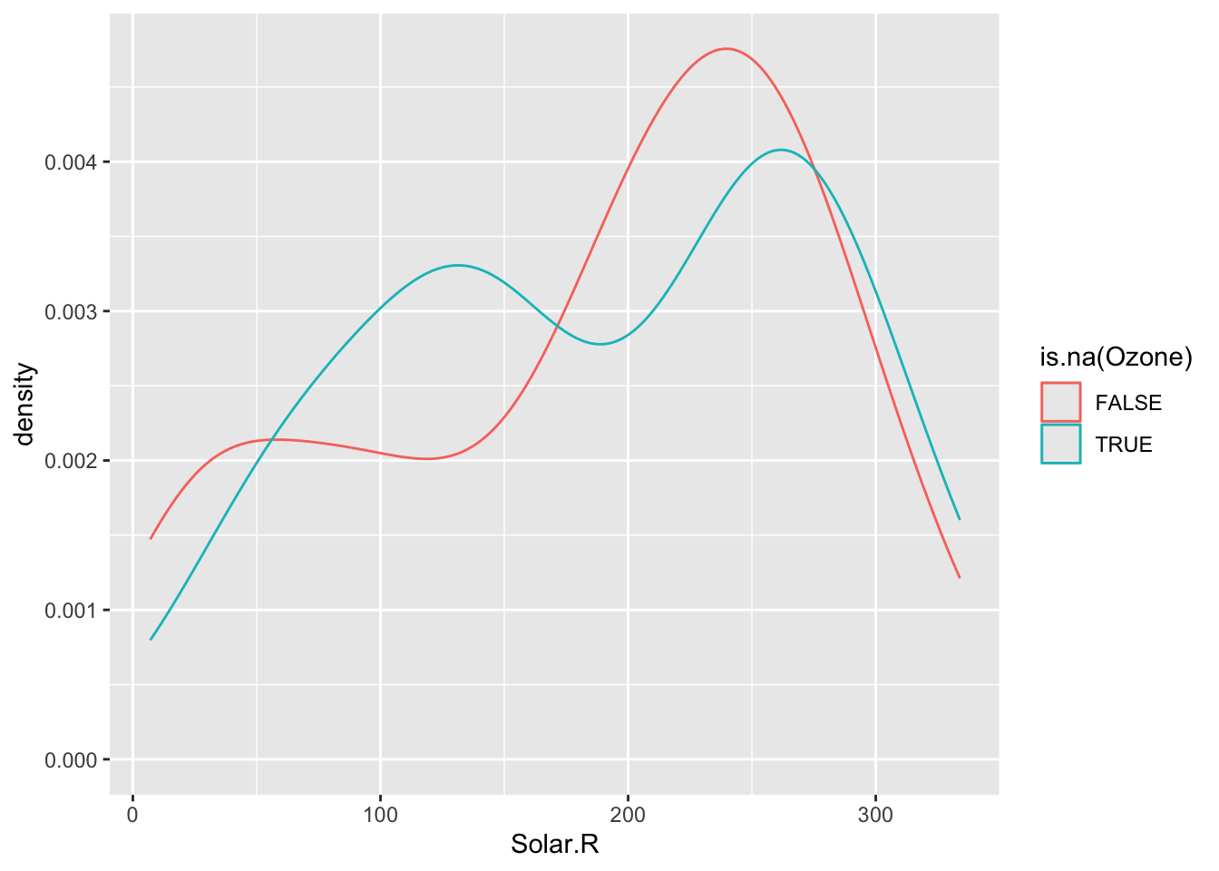 The above boxplots and density plots suggest that missing ozone is not strongly related to solar radiation levels.