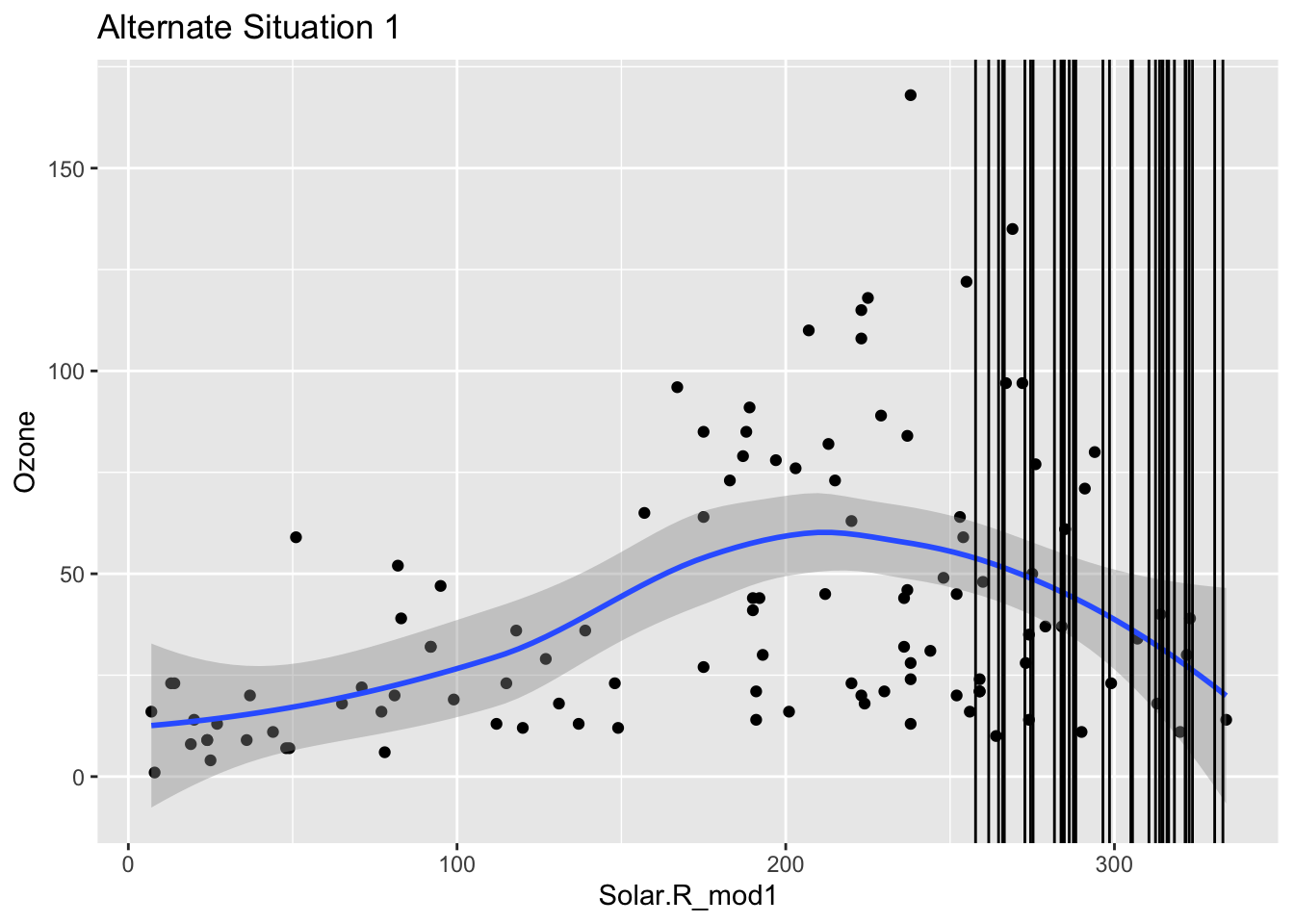 In both Alternate Situations, the Solar R for when ozone is NA is much higher than when ozone is not NA. In Alternate Situation 1 scatterplot, we see that the missing values are all at higher values of Solar R. Because we have observed data within the range of these missing values, we could fit a relationship. The scatterplot in Alternate Situation 2 shows that many of the missing ozone values are beyond the range of Solar R. A model may not be appropriate because we don’t have a good sense of the realtionship.