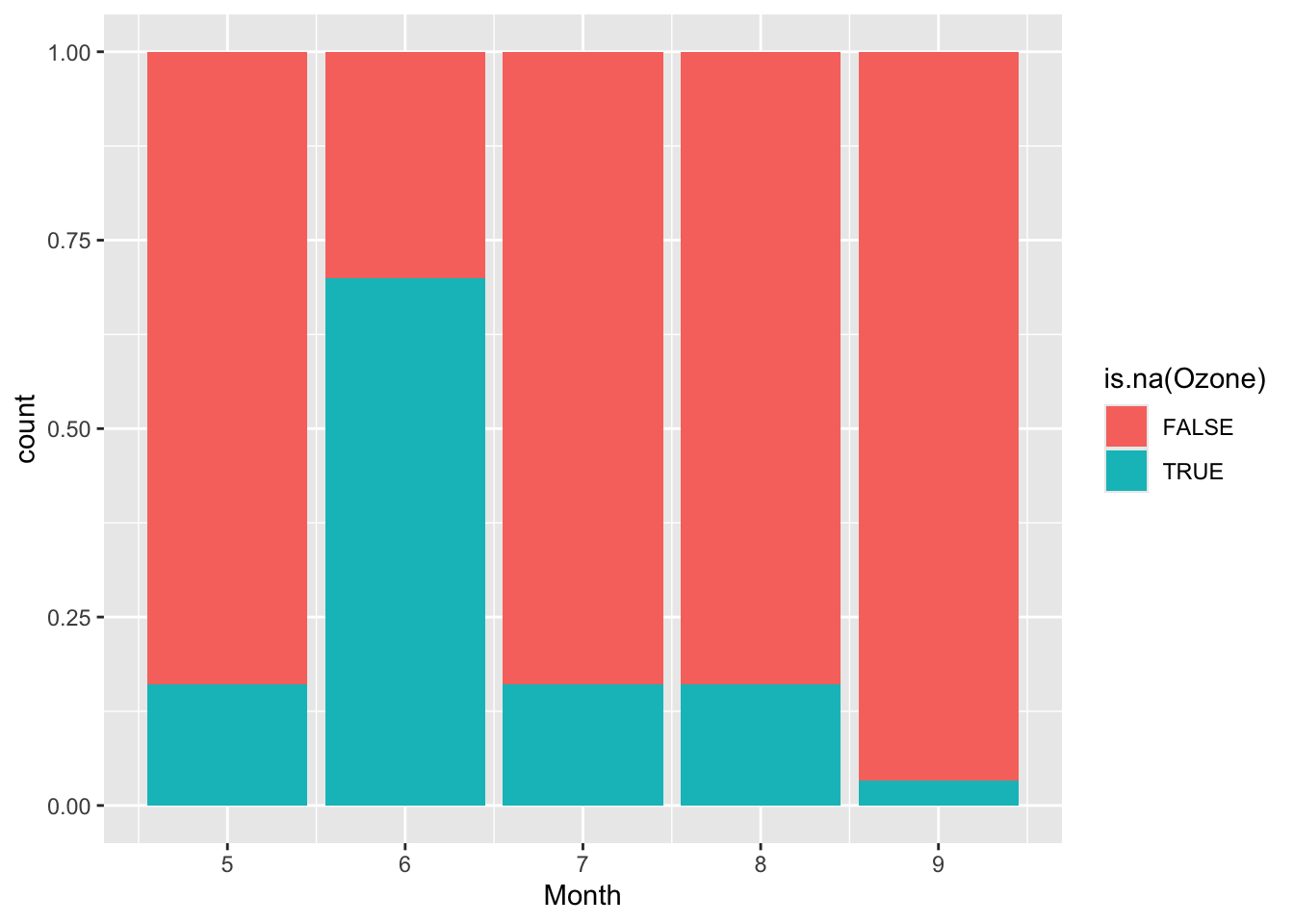We still should check if ozone missingness is related to the Wind, Temp, Month, and Day variables (to be done in Exercises).