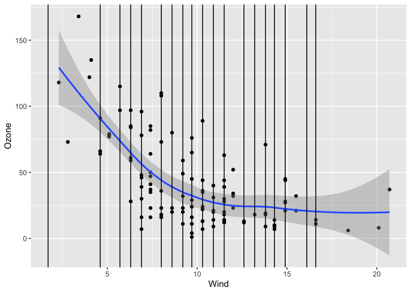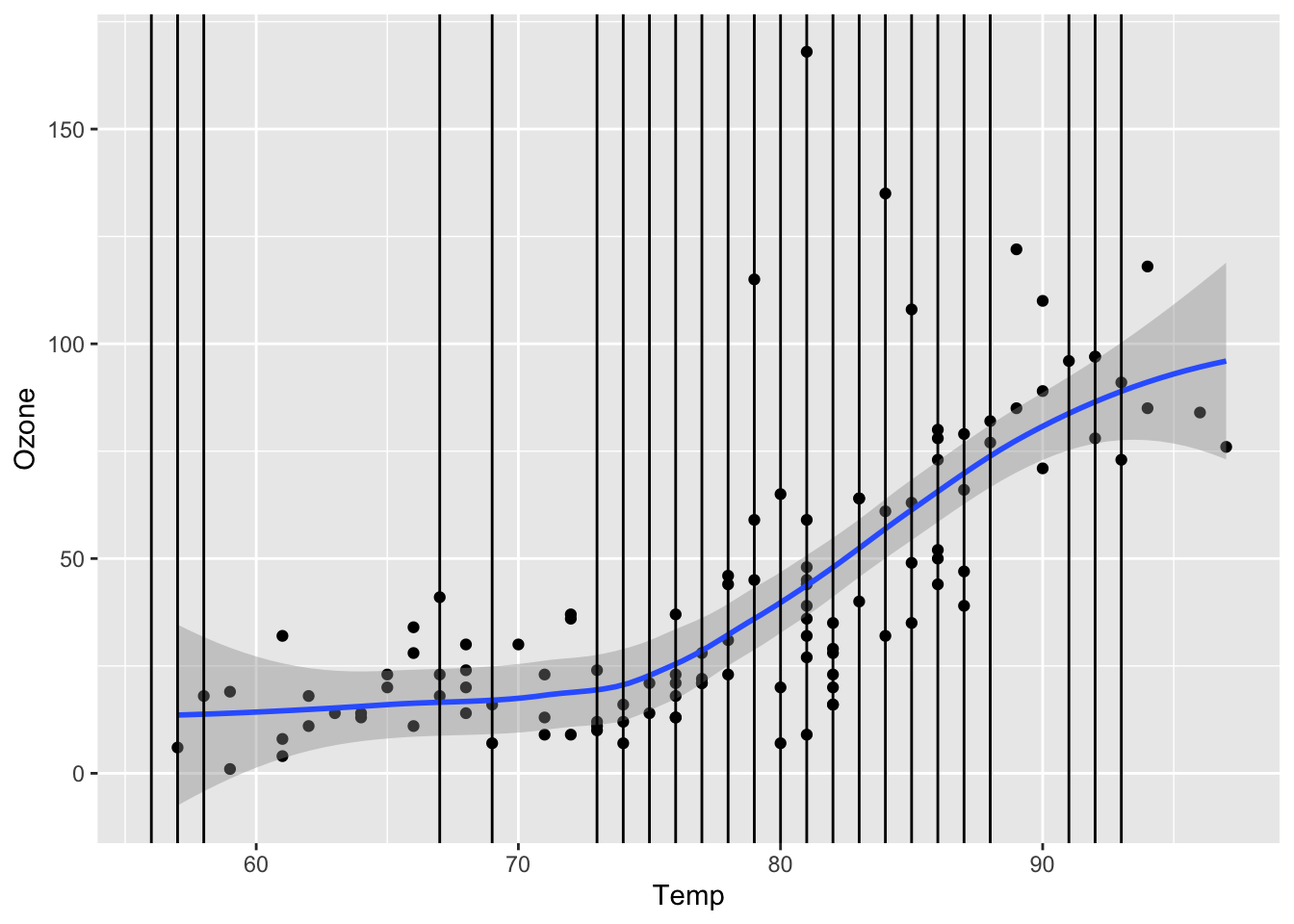 Ozonecases are within the observed span ofSolar.R, so we would be ok with predictingOzonefromSolar.Rbecause there would be no extrapolation.