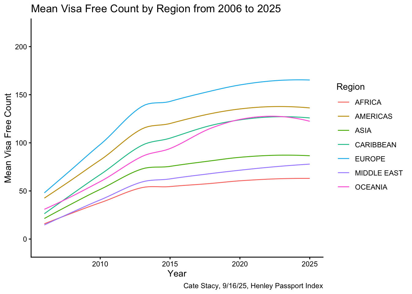 labs(x = "Year", y = "Mean Visa Free Count", title = "Mean Visa Free Count by Region from 2006 to 2025", color = "Region", caption = "Cate Stacy, 9/16/25, Henley Passport Index")