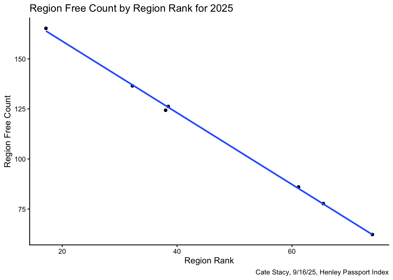 labs(x = "Region Rank", y = "Region Free Count", title = "Region Free Count by Region Rank for 2025", caption = "Cate Stacy, 9/16/25, Henley Passport Index")