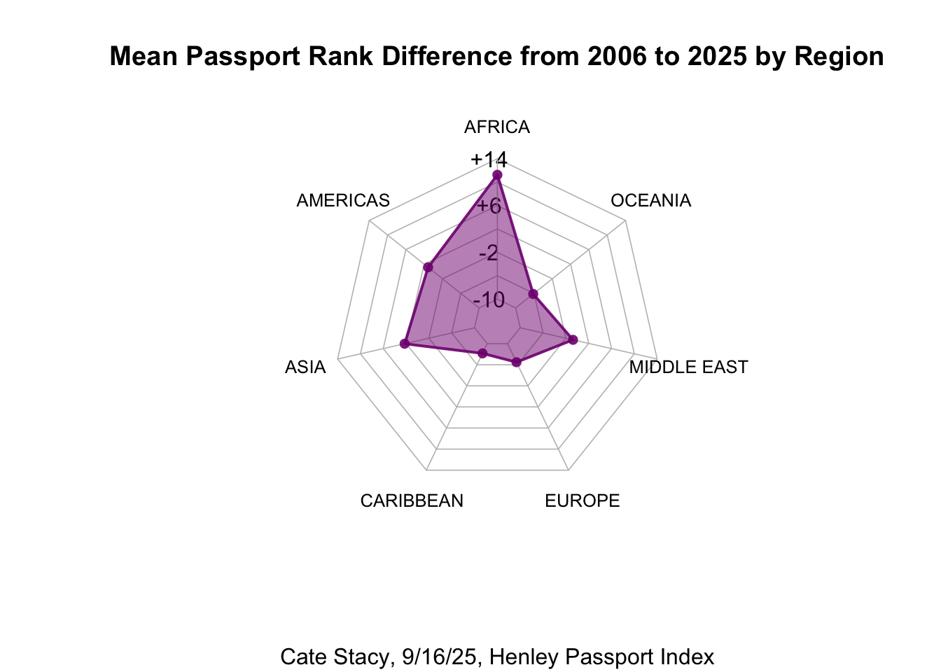 The Tidy Tuesday data for the week of 9/9/25 comes from the Henley Passport Index API. It includes information on the number of countries to which travelers in possession of each passport in the world may enter without going through the standard visa application process. The data is at the country level but also includes region groupings.
