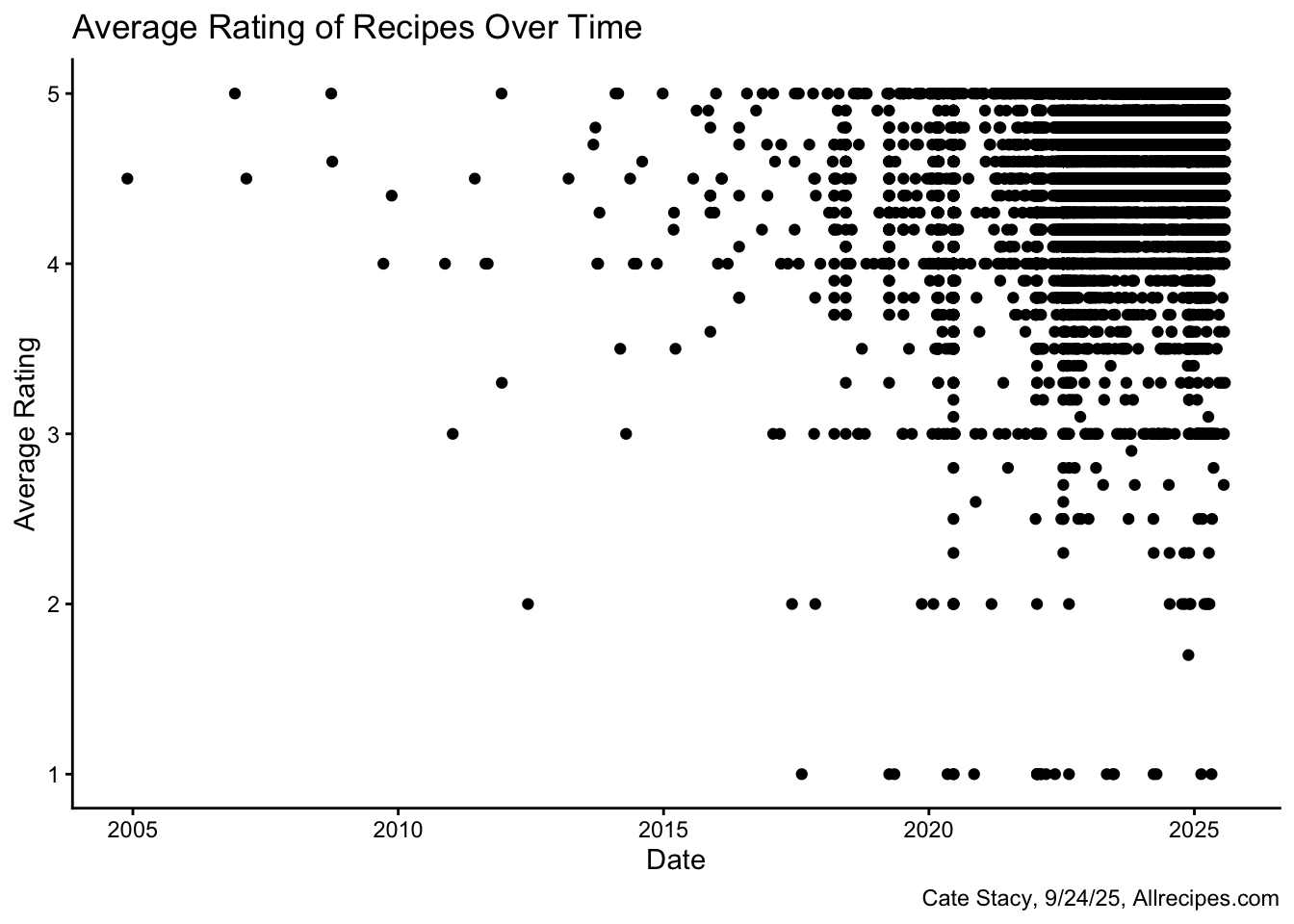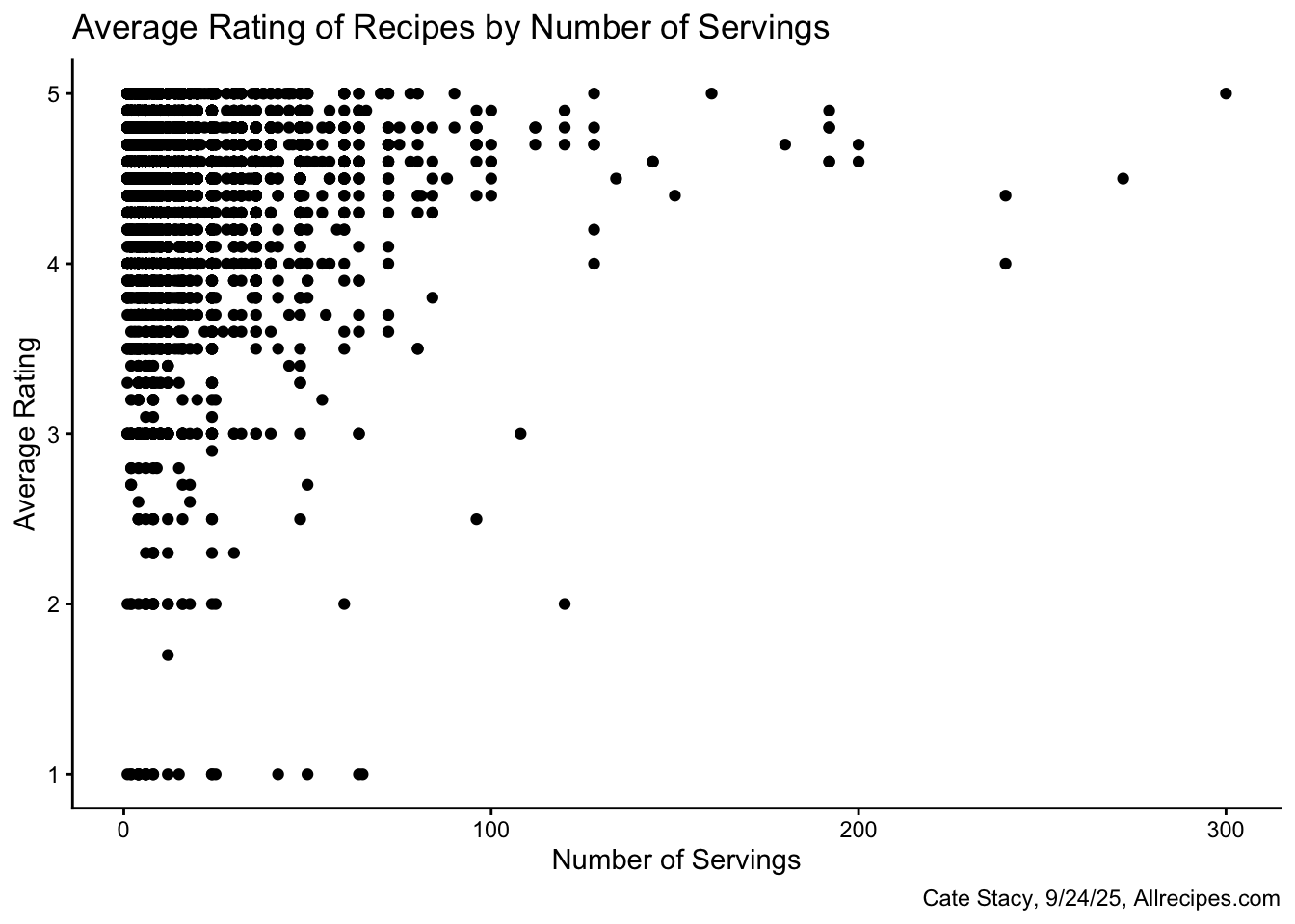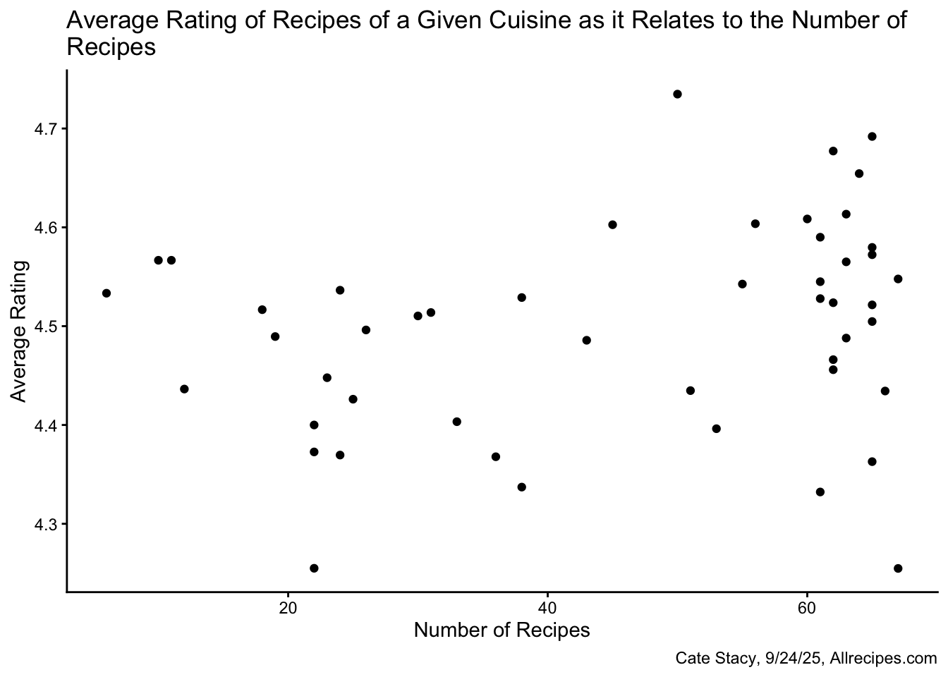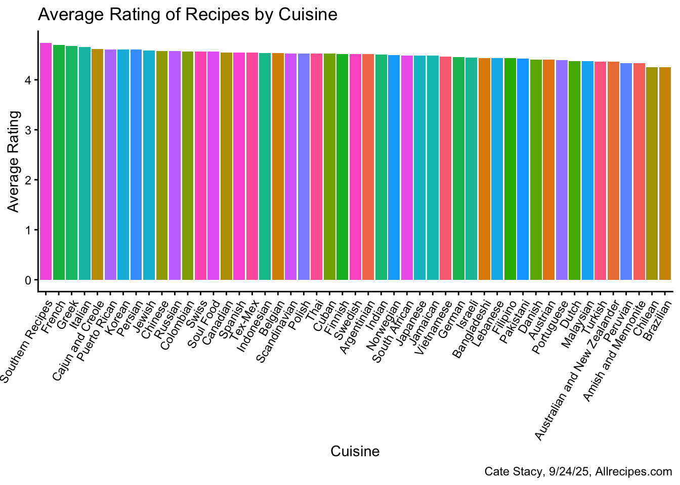 labs(title = "Average Rating of Recipes by Cuisine", x = "Cuisine", y = "Average Rating", caption = "Cate Stacy, 9/24/25, Allrecipes.com")
