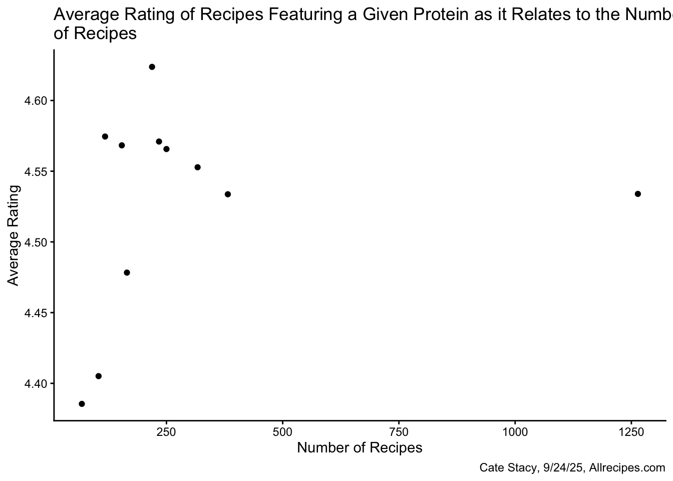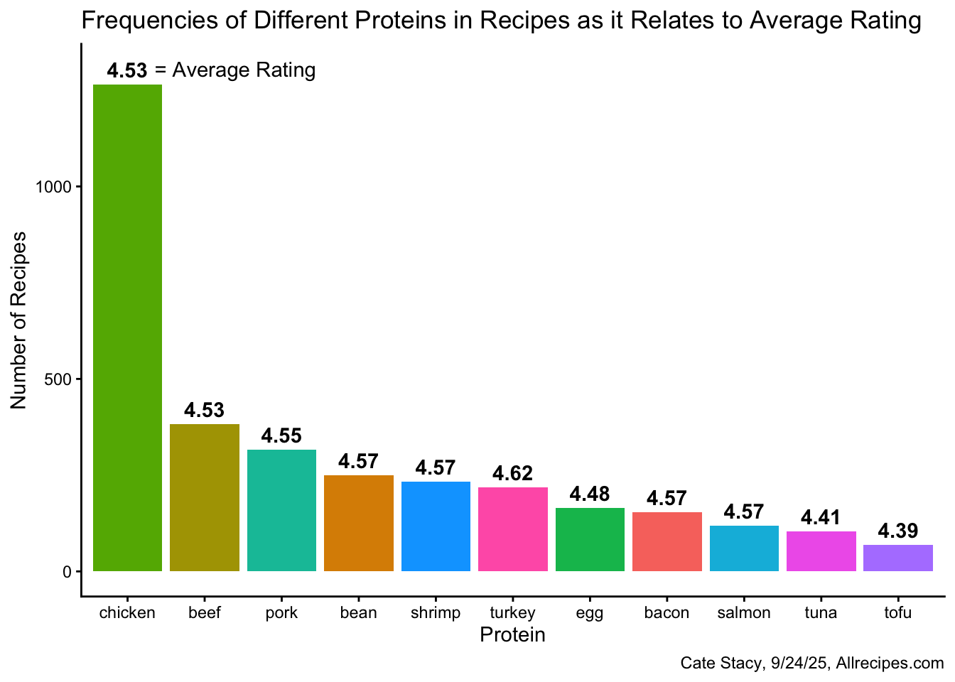 labs(title = "Average Ratings of Recipes with Different Proteins", x = "", y = "Average Rating", caption = "Cate Stacy, 9/24/25, Allrecipes.com")