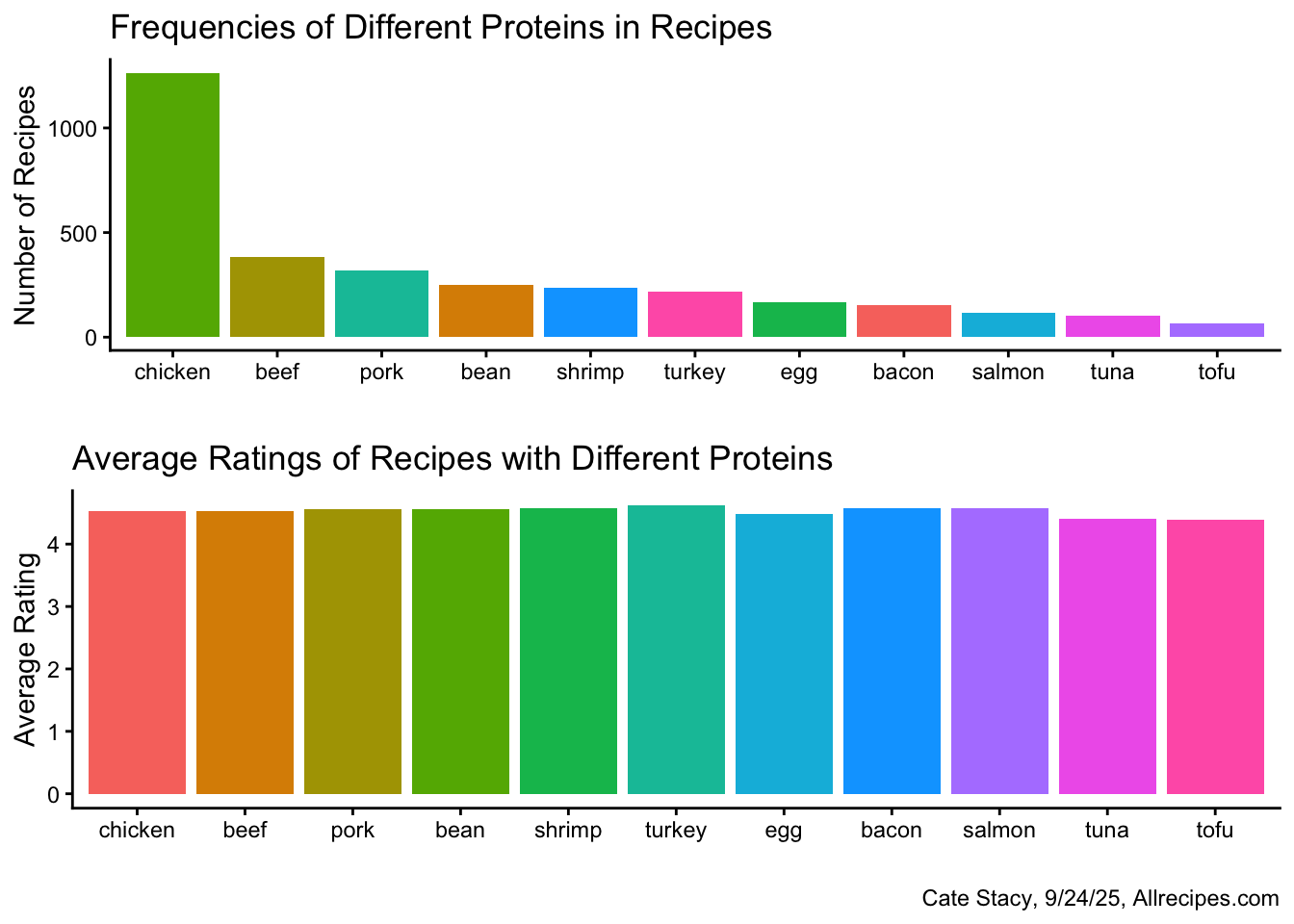 labs(title = "Frequencies of Different Proteins in Recipes as it Relates to Average Rating", x = "Protein", y = "Number of Recipes", caption = "Cate Stacy, 9/24/25, Allrecipes.com")