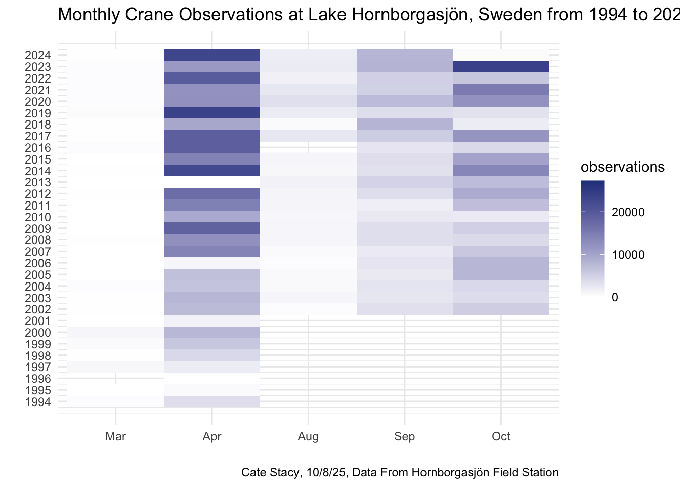 The Tidy Tuesday data for the week of 9/30/25 comes from the Hornborgasjön field station in Sweden which has been counting the number of cranes stopping at Lake Hornborgasjön during their yearly migration for over 30 years. The variables in the dataset include the date, number of observations, comment, and weather disruption.