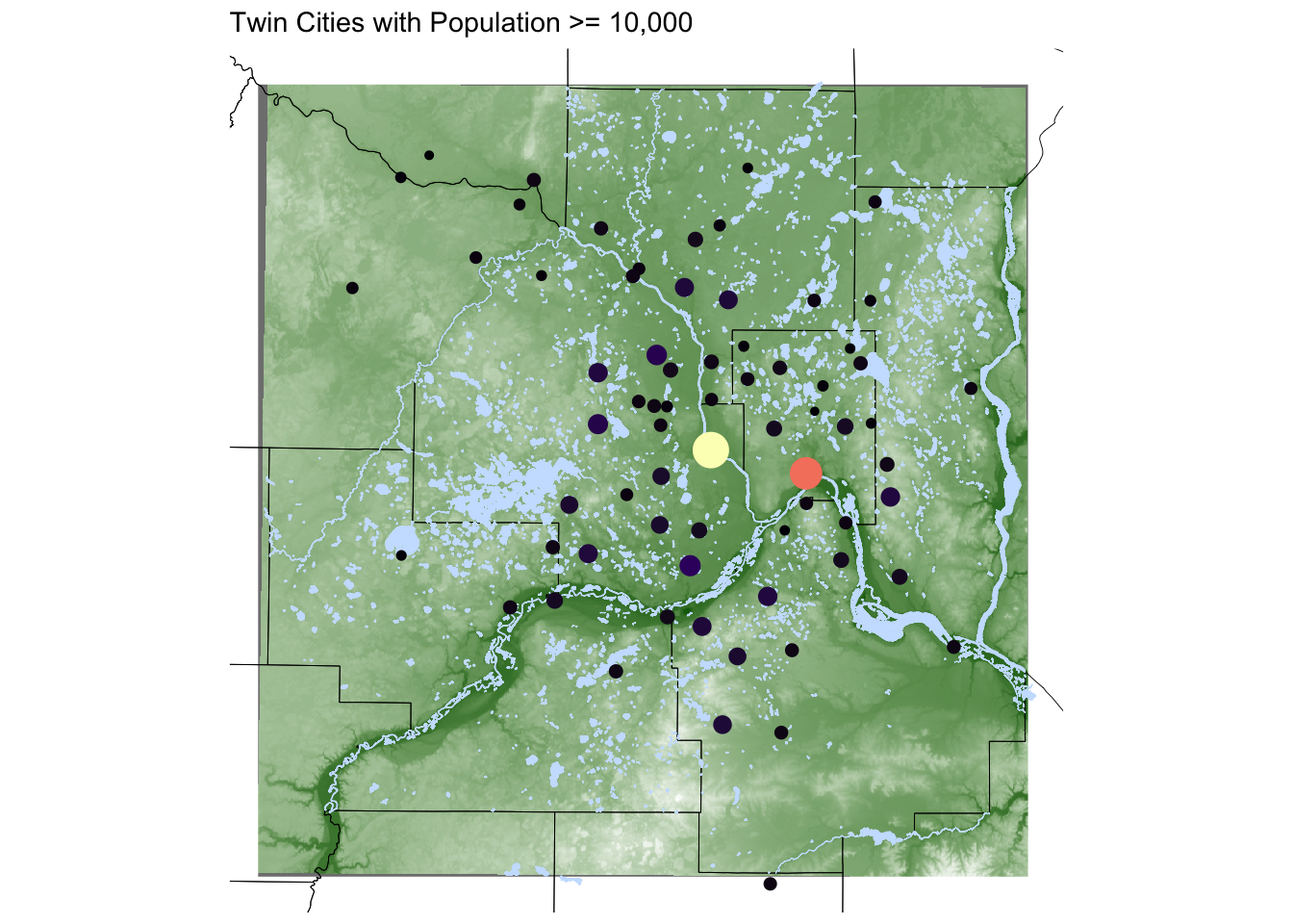 png("../figures/tc_map_zoom.png", width =500, height =500)ggplot() +geom_raster(data = elev_df, aes(x = x, y = y, fill = elevation)) +geom_sf(data = mn_counties, fill =NA, color ="black") +# county boundary layergeom_sf(data = mn_water, fill ="lightsteelblue1", color ="lightsteelblue1") +# NEW: river/lake layergeom_sf(data = mn_cities |>filter(Population >=10000), mapping =aes(color = Population, size = Population)) +# cities layerscale_color_viridis_c(option ="magma") +# continuous (gradient) color scalescale_fill_gradient(low ="darkgreen", high ="white") +# continuous (gradient) fill scalecoord_sf(xlim = seven_countyarea[c("xmin", "xmax")], ylim = seven_countyarea[c("ymin", "ymax")]) +# NEW: crop map to Twin Cities bounding boxlabs(title ="Twin Cities with Population >= 10,000") + ggthemes::theme_map() +theme(legend.position ="none") dev.off()