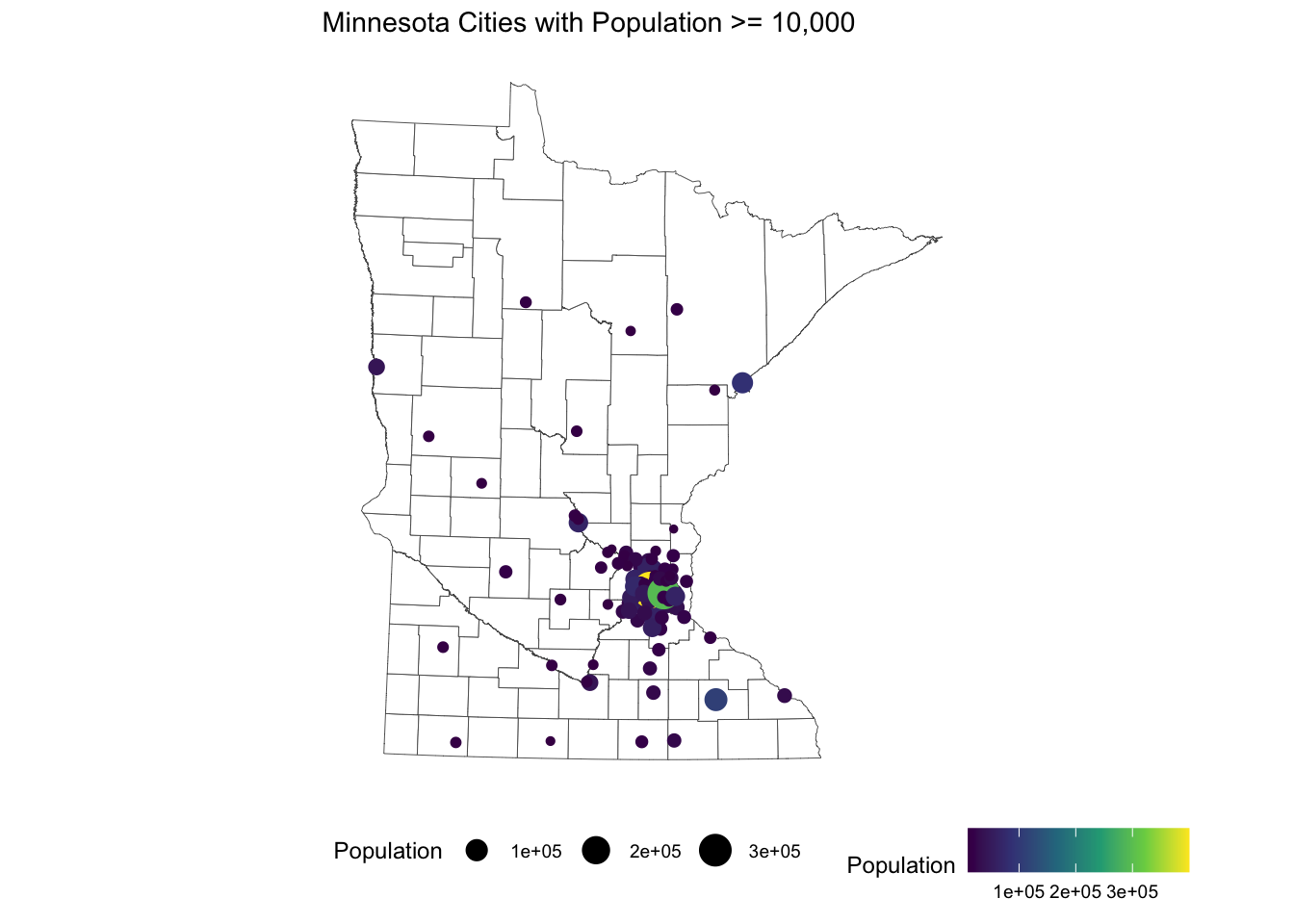 ggplot() +geom_sf(data = mn_counties, fill ="white") +geom_sf(data = mn_cities |>filter(Population >=10000), mapping =aes(color = Population, size = Population)) +# cities layerscale_color_viridis_c() +# continuous (gradient) color scalelabs(title ="Minnesota Cities with Population >= 10,000") + ggthemes::theme_map() +theme(legend.position ="bottom") # move legend