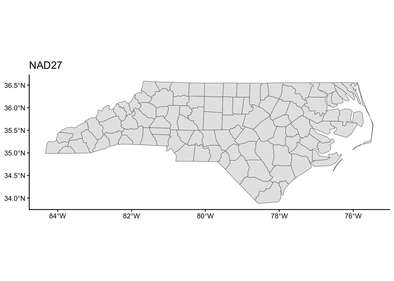 The goal is to use https://epsg.io to find two CRSs that result in a North Carolina map that is noticeably different from the original in the NAD27 CRS.
