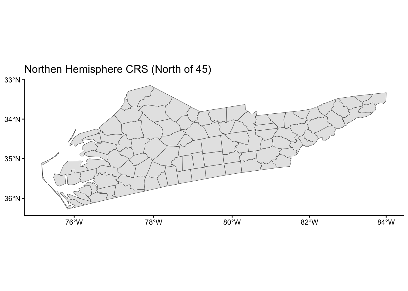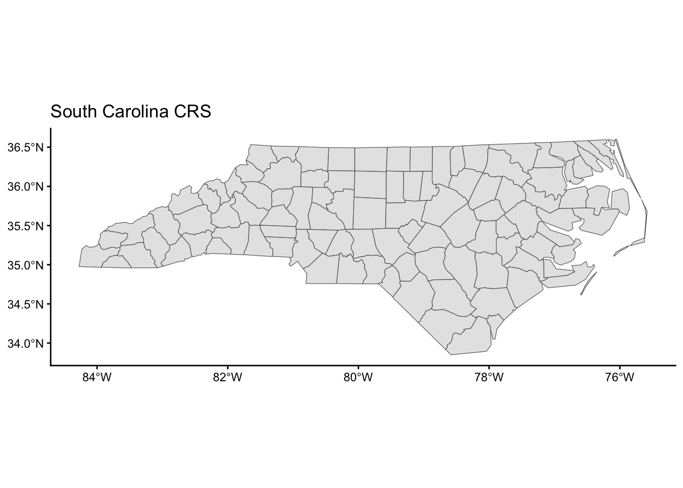 Letβs explore how changing the CRS changes the map. The st_transform() function in sf re-expresses a spatial object using a user-supplied CRS. The crs argument takes a string descriptor of the CRS. We can find these descriptors via https://epsg.io. In the example below, I searched for βSouth Carolinaβ.