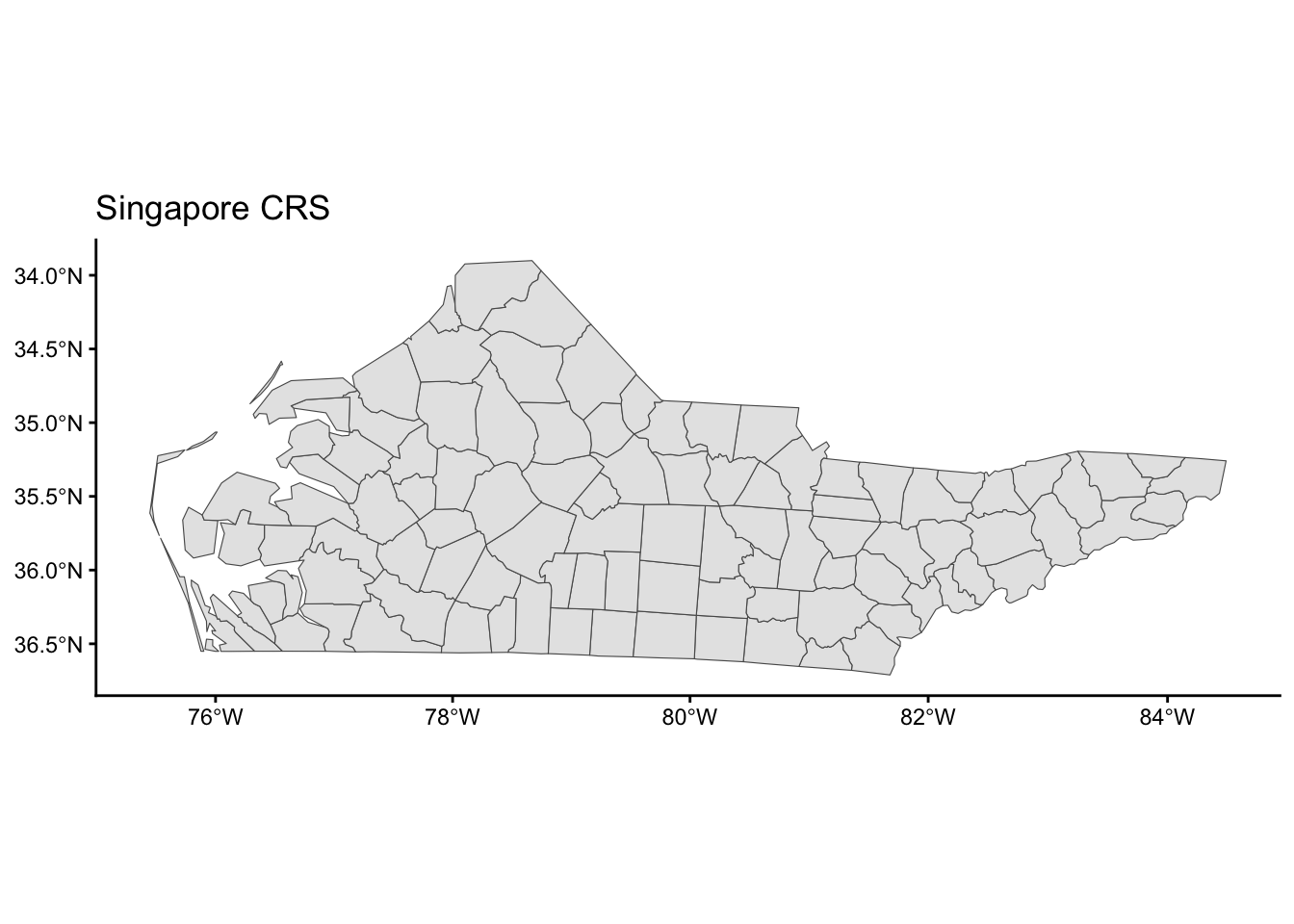 #First map with different CRS transform_and_plot(nc, new_crs ="EPSG:3414", title ="Singapore CRS")