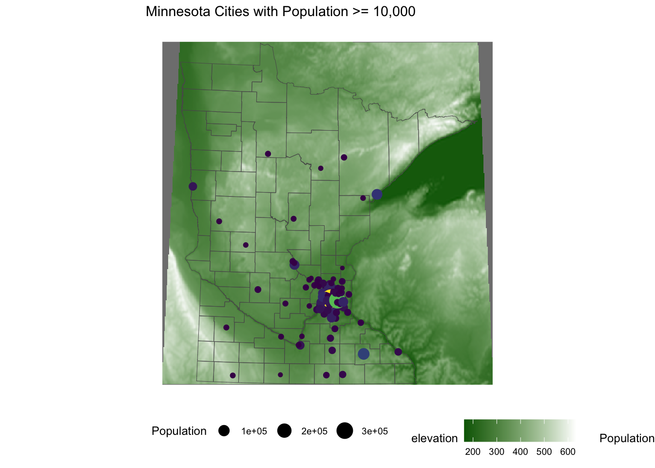 ggplot() +geom_raster(data = elev_df, aes(x = x, y = y, fill = elevation)) +scale_fill_gradient(high ="white", low ="darkgreen") +geom_sf(data = mn_counties, fill ="NA") +geom_sf(data = mn_cities |>filter(Population >=10000), mapping =aes(color = Population, size = Population)) +# cities layerscale_color_viridis_c() +# continuous (gradient) color scalelabs(title ="Minnesota Cities with Population >= 10,000") + ggthemes::theme_map() +theme(legend.position ="bottom") # move legend
