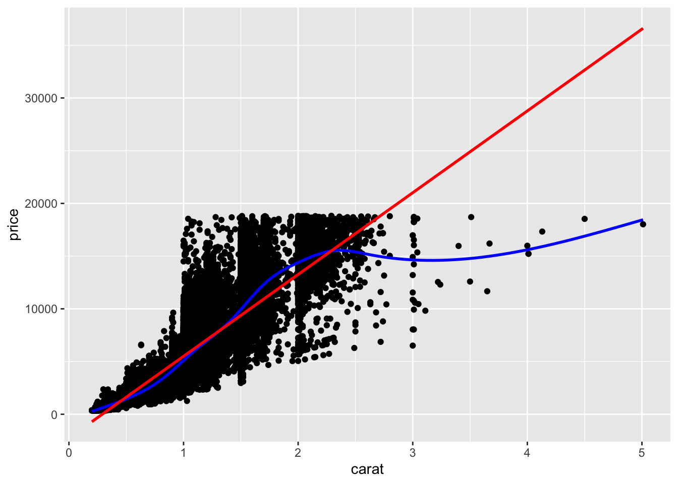 scatter_smooth <-function(df, x, y) { df |>ggplot(aes(x = {{x}}, y = {{y}})) +geom_point() +geom_smooth(alpha =0, color ="blue") +geom_smooth(alpha =0, method ="lm", color ="red")}scatter_smooth(diamonds, carat, price)