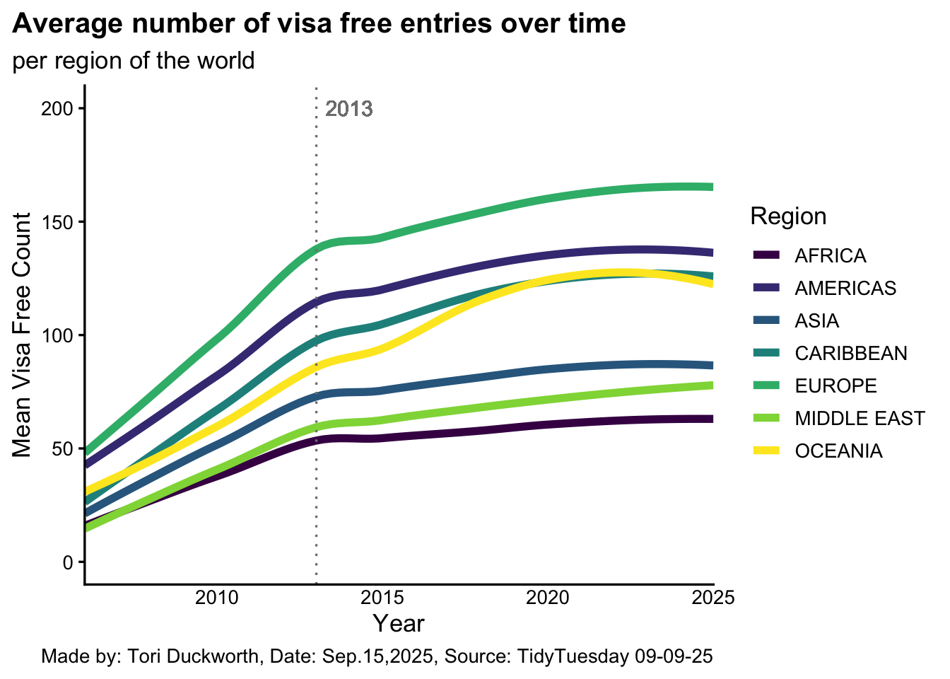 labs(alt = "alt.text = line graph showing the average number of countries a passport can enter without a visa per region over time. We can clearly see that Europe has the most passports that can visit the most counties without visas, followed by the Americas, and despite rising overtime they have not changed position. Following behind them is the caribbean followed by oceania, which are now about the same level in recent years. Then passports from Asia, the Middle east and Africa follow. There is a line marking 2013 as that is when there seems to be a global shift in the trend of allowing more visa free travel, going from a steady about 45 degree angle incline to plataueing for a year, followed by a much slower climb")