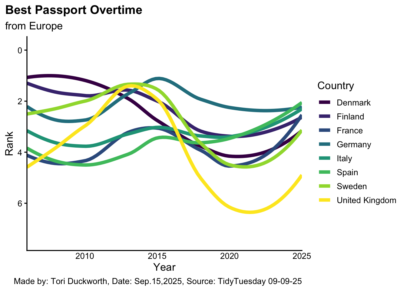 labs(title = "Best Passport Overtime", subtitle = "from Europe", x = "Year", y = "Rank", color = "Country", caption = "Made by: Tori Duckworth, Date: Sep.15,2025, Source: TidyTuesday 09-09-25") +